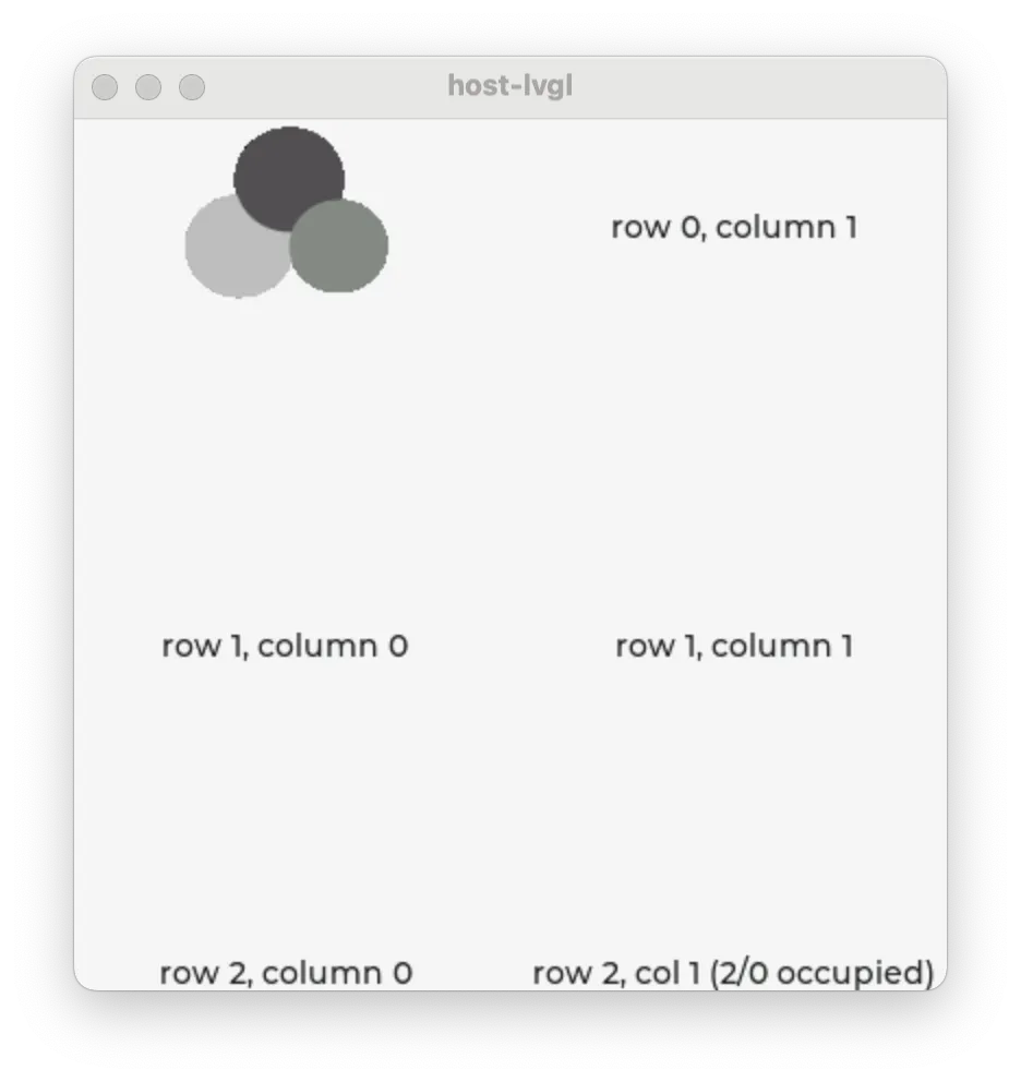 - obj: layout: type: flex pad_row: 4 pad_column: 4px flex_align_main: center flex_align_cross: start flex_align_track: end widgets: - animimg: flex_grow: 1The Grid layout in LVGL is a subset implementation of CSS Grid.